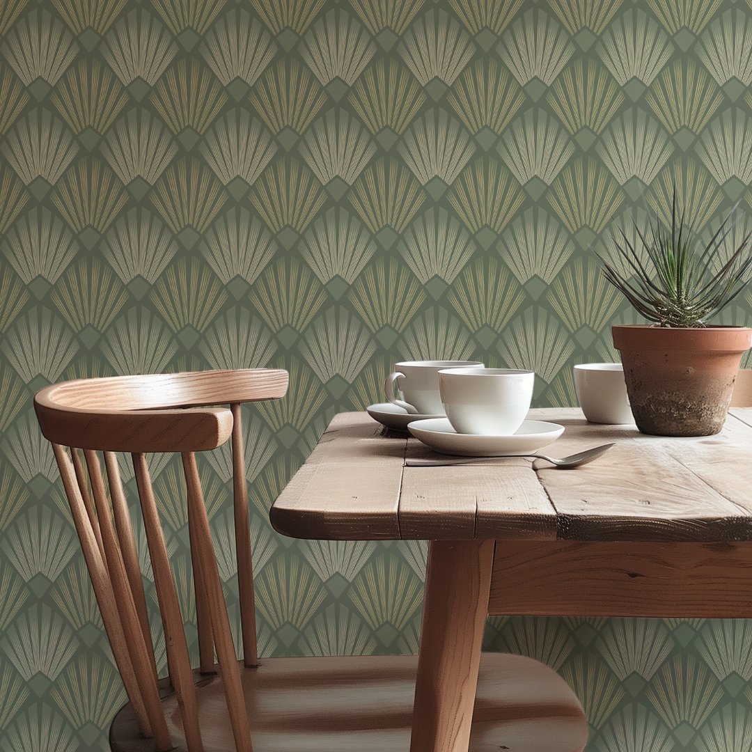 Enhance your home decor with this chic Art Deco Peel & Stick wallpaper, featuring a sophisticated geometric design in a soothing sage green palette. The pattern showcases elegant fan and diamond shape